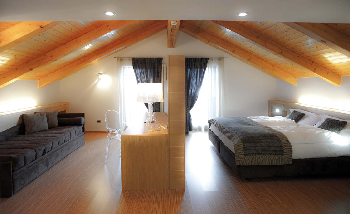 Pokoje: Pokoje są komfortowe i gustownie urządzone w klasycznym, górskim stylu, z przewagą drewna i stonowanej kolorystyki. Każdy z nich wyposażony jest w łazienkę z prysznicem lub wanną, suszarkę do włosów, telewizor, telefon oraz sejf. Część pokoi posiada balkon.