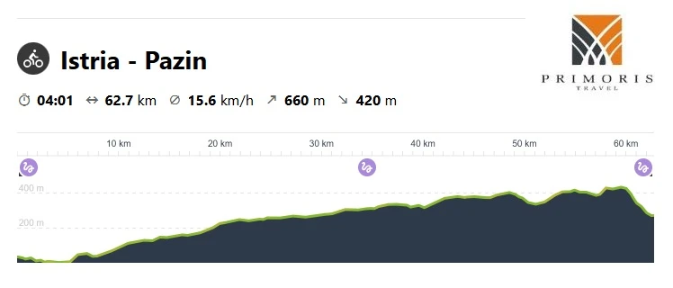 Tym razem zgłębimy centralną część Istrii – odwiedzimy Pazinską Jamę oraz miasteczko Pazin z zamkiem usytuowanym na stumetrowym klifie. Kanion i krasowa jama wraz z wpływającą do niej rzeką i wewnętrznymi jeziorami stanowią chroniony obszar. Osobom chcącym odpocząć od roweru proponujemy wycieczkę fakultatywną na archipelag Wysp Brońskich.