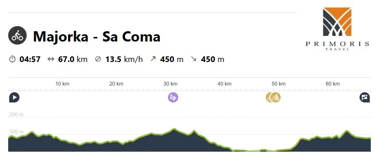 Naszą rowerową wyprawę rozpoczniemy od spokojnej jazdy wzdłuż bajecznego wybrzeża Majorki. Trasa będzie wiodła przez okolice stolicy wyspy i dalej wzdłuż złocistych plaż znanych kurortów Playa de Palma, Can Pastilla i El Arenal. Właśnie w El Arenal odpoczniemy na jednej z piaszczystych plaż, a wracając do hotelu chętni będą mogli odwiedzić słynne akwarium w Palmie.