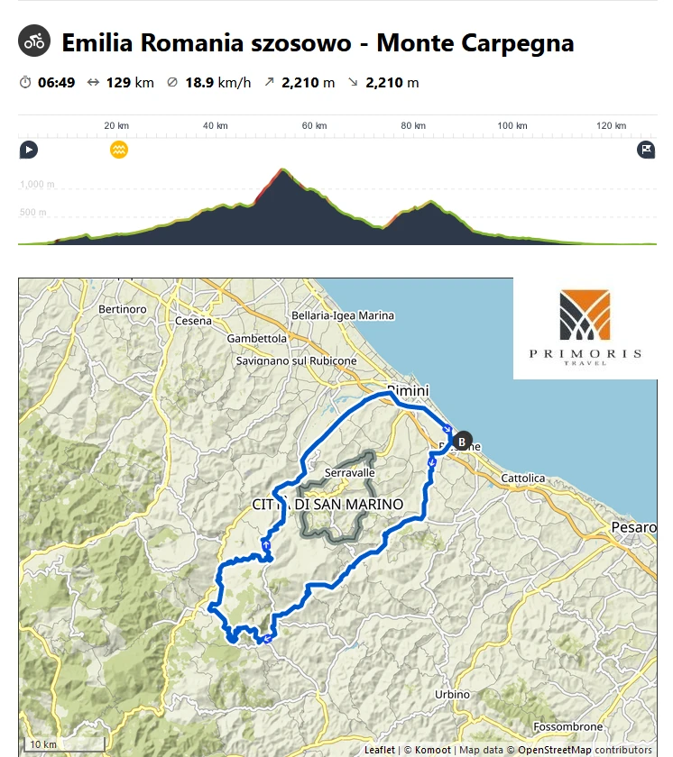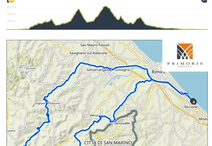 Kolejny dzień wyprawy przeznaczymy na zdobycie najsłynniejszego podjazdu, na którym trenował Marco Pantani - Monte Carpegna. Właściwy podjazd ma 6km i ponad 10% średniego nachylenia, ale za nim do niego dotrzemy musimy pokonać 47km trasę, która cały czas delikatnie pnie się do góry.