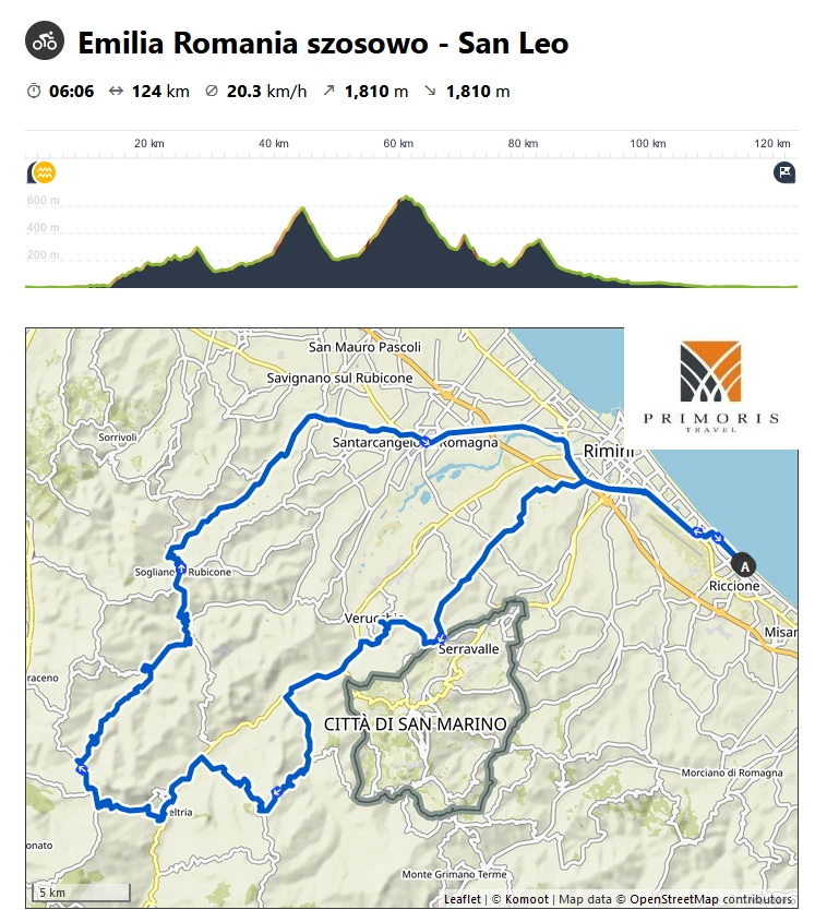 Dzisiejszą trasę, z uwagi na przewyższenia, częściowo pokonamy busem. Przed nami wyprawa śladami średniowiecznych zamków i fortec. Naszym celem będzie niezwykła miejscowość San Leo, wzniesiona na szczycie skalnego wzniesienia. Jednak zanim się do niej dostaniemy pokonamy kolejny z podjazdów Marco Pantaniego o długości 12,5km i 518m przewyższenia.