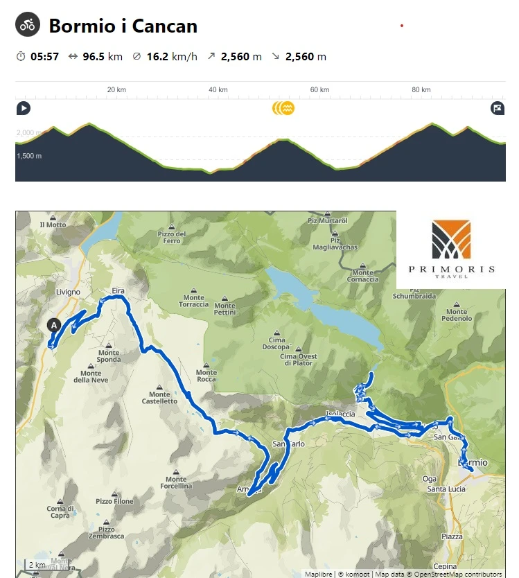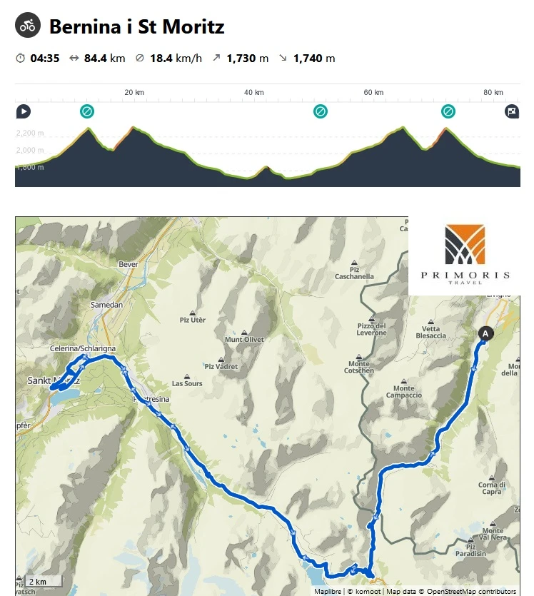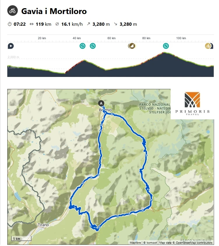 Zwiedzimy przełęcze: kultowe Stelvio (Cima Coppi naszego wyjazdu), Gavia, Mortiloro i Bernina a także wjedziemy do Bormio i Cancan oraz do Tirano i St. Moritz.