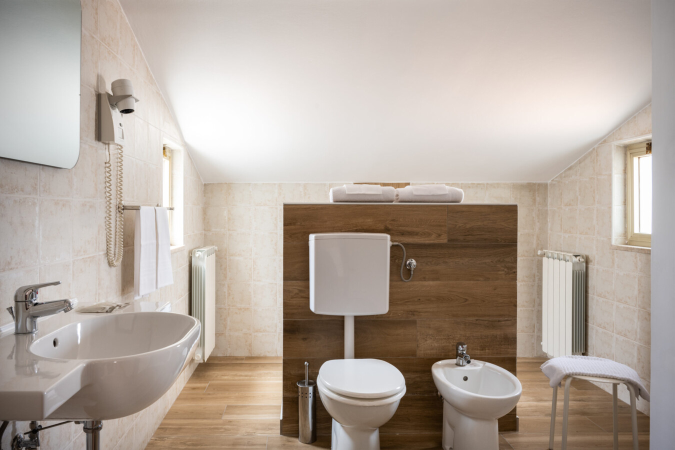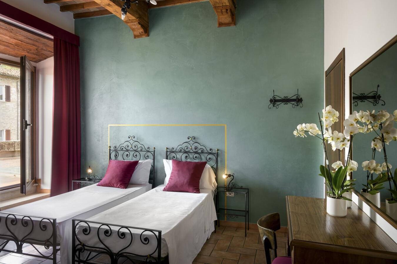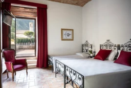 Pokoje w hotelu są przytulne, elegancko urządzone w klasycznym włoskim stylu i wyposażone we wszystkie niezbędne udogodnienia: klimatyzację, telewizor, minibar oraz bezpłatne Wi-Fi. Część pokoi oferuje widok na otaczające wzgórza Umbrii lub na urokliwe uliczki Gubbio, zapewniając gościom komfortowy wypoczynek w autentycznej włoskiej scenerii.