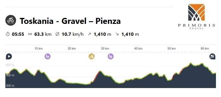 Dzisiaj po śniadaniu udamy się w głąb regionu, aby zobaczyć krajobrazy widniejące w przewodnikach i katalogach turystycznych o Toskanii. Naszym głównym celem będzie piękne miasteczko Pienza. Dzięki położeniu na szczytu wzgórza, z miasta rozpościera się malowniczy widok na okolice doliny Orcia. Po odpoczynku udamy się rowerami w drogę powrotną do hotelu.