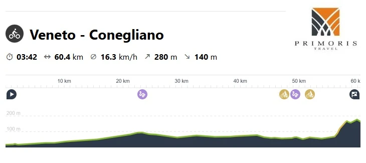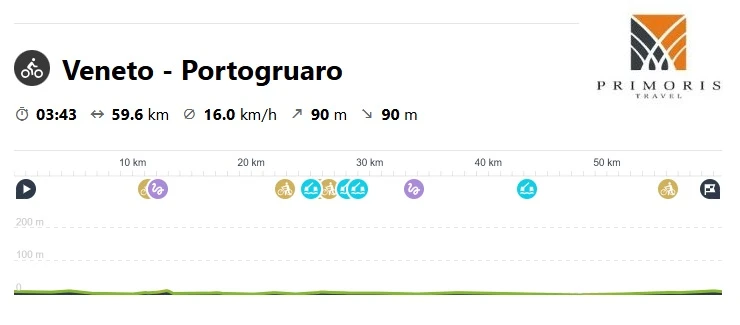 Dzisiejszego dnia również udamy się na południe w kierunku Adriatyku. Naszą wyprawę rowerową rozpoczniemy z hotelu, tym razem jednak udamy się na wschód, wzdłuż wybrzeża. Po drodze będziemy mijali piaszczyste plaże i nadmorskie kurorty jak chociażby Caorle. Naszym celem będzie Portogruaro.
