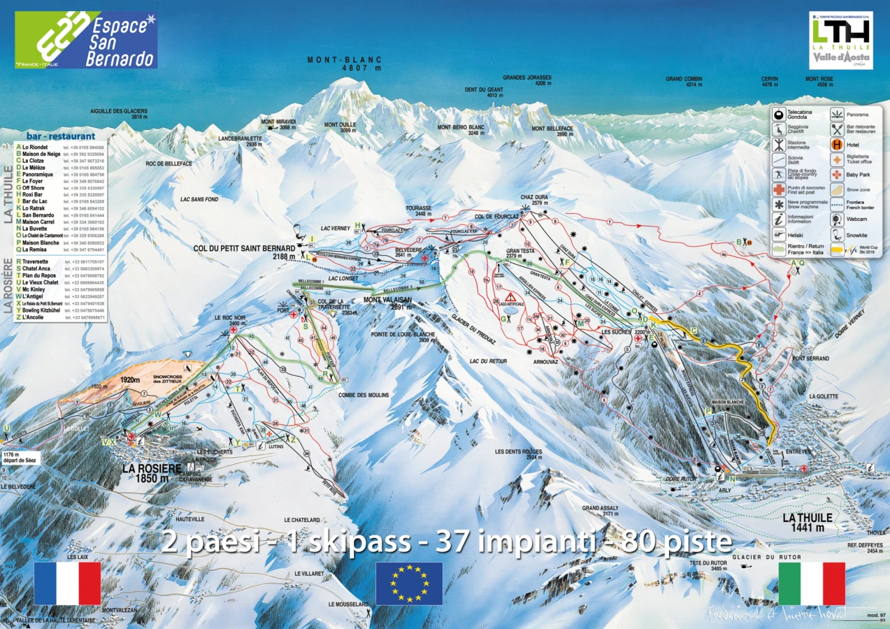 Po włoskiej stronie dostępne są zarówno krótkie zjazdy z szybkimi odcinkami, jak i długie trasy, w tym 11-kilometrowa czerwona San Bernardo z różnicą poziomów dochodzącą do 1100 m. W ofercie ośrodka jest też szereg atrakcji zimowych, którymi narciarze mogą wypełnić czas poza zjazdami. Nartostrady po stronie francuskiej znajdują się w większości na południowych stokach i należą do bardziej stromych. Wyczynowcy znajdą tutaj snowparki, a rodziny z dziećmi strefy do nauki czy mini snow park “Lièvre Blanc”.