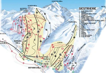 Na bardziej wymagających narciarzy czekają tutaj trasy zjazdowe ze szczytu Mont Sises, na których są rozgrywane zawody w ramach mistrzostw w narciarstwie alpejskim. Stok Sises uchodzi za jedną z najtrudniejszych technicznie tras zjazdowych na świecie. Średnio zaawansowani narciarze mogą spróbować swoich sił na stokach położnych na zboczach Monte Motta, w tym na słynnej olimpijskiej trasie zjazdowej. Sestriere połączone jest szybką kolejką linową z miejscowości Pragelato, która jest symbolem całego regionu.