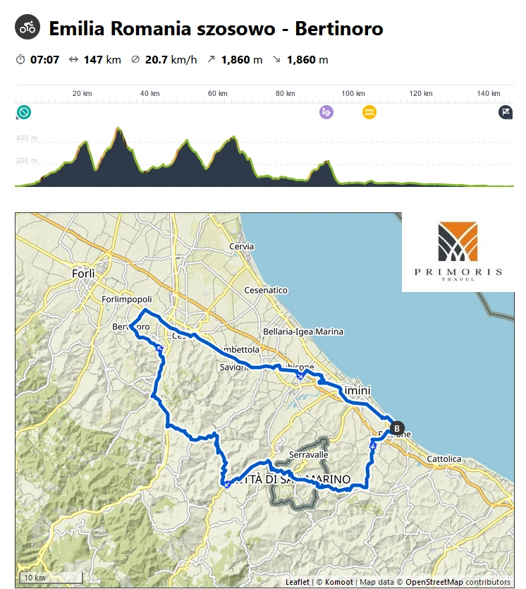 Czeka nas dzisiaj "królewski" etap. Naszym celem będzie Bertinoro. Jest to niewielka, ale przepięknie położona na zboczu góry miejscowość, słynąca z wina i tysiącletniej fortecy. W twierdzy znajduje się duży balkon z widokiem na wioskę oraz imponująca XVII-wieczna sala ozdobiona barokowymi freskami. Obowiązkowym punktem podczas zwiedzania Bertinoro jest również wizyta na głównym placu miasta, Piazza della Libertà, gdzie znajduje się zabytkowy ratusz. Ogromną atrakcją Bertinoro jest też zapierający dech w piersiach widok, roztaczający się aż po Adriatyk. W końcu nie bez przyczyny Bertinoro nazywane jest „Balkonem Romanii”. Poniżej głównego placu znajduje się restauracja serwująca lokalne dania z widokiem na całą okolicę.