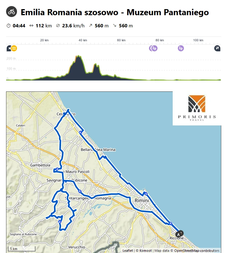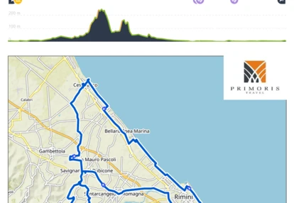 Naszą włoską przygodę z Emilio Romanią rozpoczniemy od trasy związanej z najsłynniejszym kolarzem, który pochodził z tego regionu Marco Pantaniego. Pojedziemy bowiem do Muzeum Pantaniego w Cesenatico. W celu urozmaicenia trasy, która przebiegałaby wzdłuż wybrzeża, zaliczone zostaną okoliczne wzgórza, które wyrastają już około 15km od linii morza. Dają też obraz co czeka nas eksplorując region. Podjazdy o długości 3km ze średnim nachyleniem 4% lub jednokilometrowe, 10% sztajfy pozwolą wycisnąć siódme poty. Po zaliczeniu paru wzniesień, skierujemy się do celu podróży. W muzeum można podziwiać kolekcje pucharów, koszulek, rowerów Marco Pantaniego.
