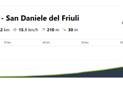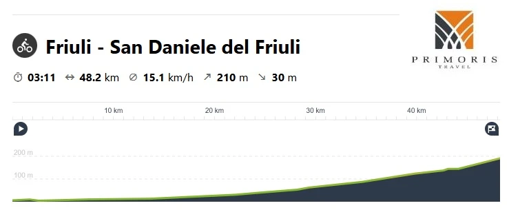 Dzisiaj czeka nas nieco trudniejszy dzień. Do pokonania mamy blisko 50 kilometrowy odcinek z okolic Latisany do San Daniele del Friuli. Trasa będzie prowadziła w większości pod górę, ale o bardzo delikatnym nachyleniu, więc nie powinniśmy odczuć zmęczenia.