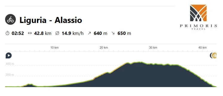 Kolejny dzień we włoskiej Ligurii upłynie nam na podróży w głąb lądu. Czeka nas dzisiaj niewątpliwie jeden z bardziej wymagających odcinków, ale widoki nam towarzyszące na pewno umilą nam całą podróż. Do pokonania mamy nieco ponad 40 kilometrów, początkowe 15 kilometrów będziemy jechali po płaskim terenie, a następnie czeka nas blisko 10 kilometrowy podjazd na wysokość około 450 metrów.