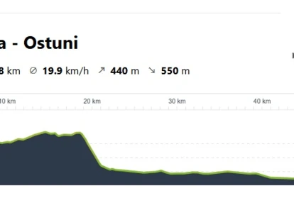 Tym razem udamy się na południowy-wschód w kierunku miasta Ostuni, które będzie naszym dzisiejszym celem. Będziemy poruszali się głównie bocznymi drogami asfaltowymi, więc ruch samochodowy nie powinien nam doskwierać. Część trasy będziemy musieli pokonać głównymi oraz szutrowymi drogami. Do pokonania mamy około 52 kilometrów, a teren po którym będziemy się poruszali będzie nieco pagórkowaty, więc nie zabraknie krótkich podjazdów, szczególnie na pierwszym etapie podróży.