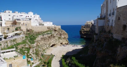 Po dotarciu na miejsce naszym oczom ukaże się maleńka, romantyczna plaża, jakby schowana przed światem pomiędzy dwoma klifami, a na nich białe domy, których kolor pięknie współgra z błękitem Adriatyku… brzmi ciekawie, prawda? Mowa tu o jednej z najpiękniejszych plaż Apulii, Lama Monachile, która znajduje się w urokliwym Polignano a Mare. Polignano a Mare jest niewielkim miasteczkiem wybudowanym na skalistym wybrzeżu Adriatyku. Typowa, ciasna zabudowa, wąskie uliczki i przepiękne widoki sprawiają, że miasteczko, mimo tego, że niewielkie, jest lubianą i cenioną destynacją wśród turystów. Mnóstwo tu także jaskiń, czy grot skalnych widocznych wyłącznie od strony morza. W jednej z nich znajduje się ekskluzywna restauracja, serwująca dania na najwyższym poziomie. Natomiast miłośników włoskiej piosenki i festiwalu w San Remo zapraszamy na wspólne odśpiewanie „Nel blu, dipinto di blu (Volare)”, pod tutejszym pomnikiem autora piosenki, Domenico Modugno.
