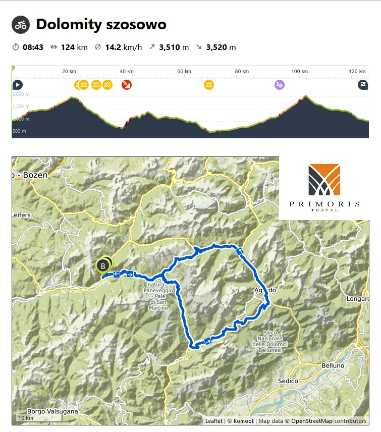 Najbliższe sześć dni to prawdziwa uczta dla miłośników szosowej jazdy rowerowej. Podczas pobytu w Dolomitach będziemy mieli możliwość odwiedzenia wielu ciekawych zakątków dolin Val di Fassa oraz Val di Fiemme, m. in. region Bolzano, Canazei, Obereggen, San Martino di Castrozza i wiele, wiele innych.
