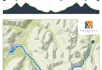Dzień zaczniemy od 12 km podjazdu pod przełęcz Forcola (2315 m n.p.m.) ze średnim nachyleniem 4,1%. Po krótkim, aczkolwiek stromym zjeździe, wjeżdżamy do Szwajcarii i rozpoczynamy podjazd o długości 3,4km pod przełęcz Bernina (2328 m n.p.m.). Stąd już tylko 15 km zjazdu do Sankt Moritz. W drodze powrotnej pokonujemy tą samą trasę, a więc na przełęcz Bernina wjeżdżamy 15 km ze średnim nachyleniem 3,7%, a maksymalne nachylenie na odcinku 1,5km wynosi 7%. Stąd kierujemy się w stronę Włoch i przełęczy Forcoli. Zanim się na nią wdrapiemy musimy pokonać podjazd o długości 3,4 km i 253 m przewyższenia, co daje średnio 7,5% nachylenia.
