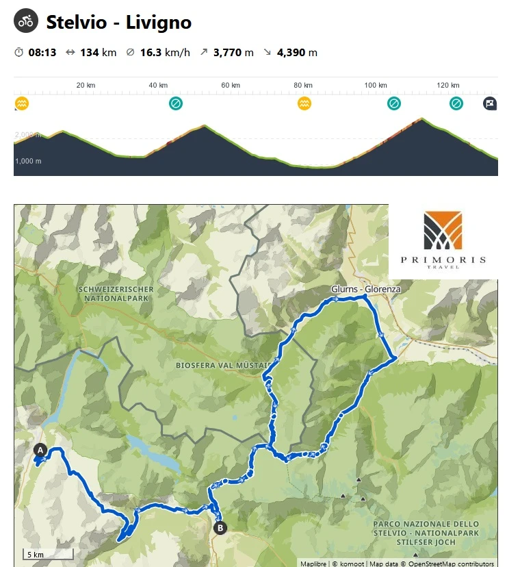 Na samym początku pokonamy tą samą drogę kierując do Bormio, a więc pokonamy przełęcze Eira i Foscagno. Po długim zjeździe odbijemy w kierunku przełęczy Stelvio. Będzie to rozgrzewka przed czekającymi, wymagającymi podjazdami. Od strony Bormio podjazd ma 20,5km długości wraz z 1451 metrów przewyższenia (średnio 7,1%) , a od strony Prato: 24,6 km długości i 1870 metrów przewyższenia (średnio 7,5%). Po dwukrotnym pokonaniu przełęczy, zjeżdżamy do Bormio skąd wracamy busem do Livignio.