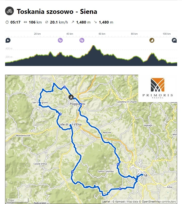 Po krótkim zwiedzaniu Sieny wracamy na północ. W pierwszej kolejności musimy pokonać wzgórza na zachód od Sieny (500m n.p.m.) , a następnie zjedziemy do doliny, którą będziemy zmierzali do San Gimignano. Przed dotarciem do miasteczka pokonamy jeszcze dwa podjazdy, 2km z 2,5% nachyleniem i drugi podjazd prowadzący do celu o długości 3,0km ze średnim nachyleniem 5,7%. San Gimignano nazywane jest „Manhattanem Europy”, gdyż nad miasteczkiem górują charakterystyczne, widoczne z daleka kamienne wieże, a w zabytkowym centrum podziwiać można doskonale zachowane budowle. Po krótkim pobycie i skosztowaniu wspaniałych lodów wracamy do Poggibonsi.
